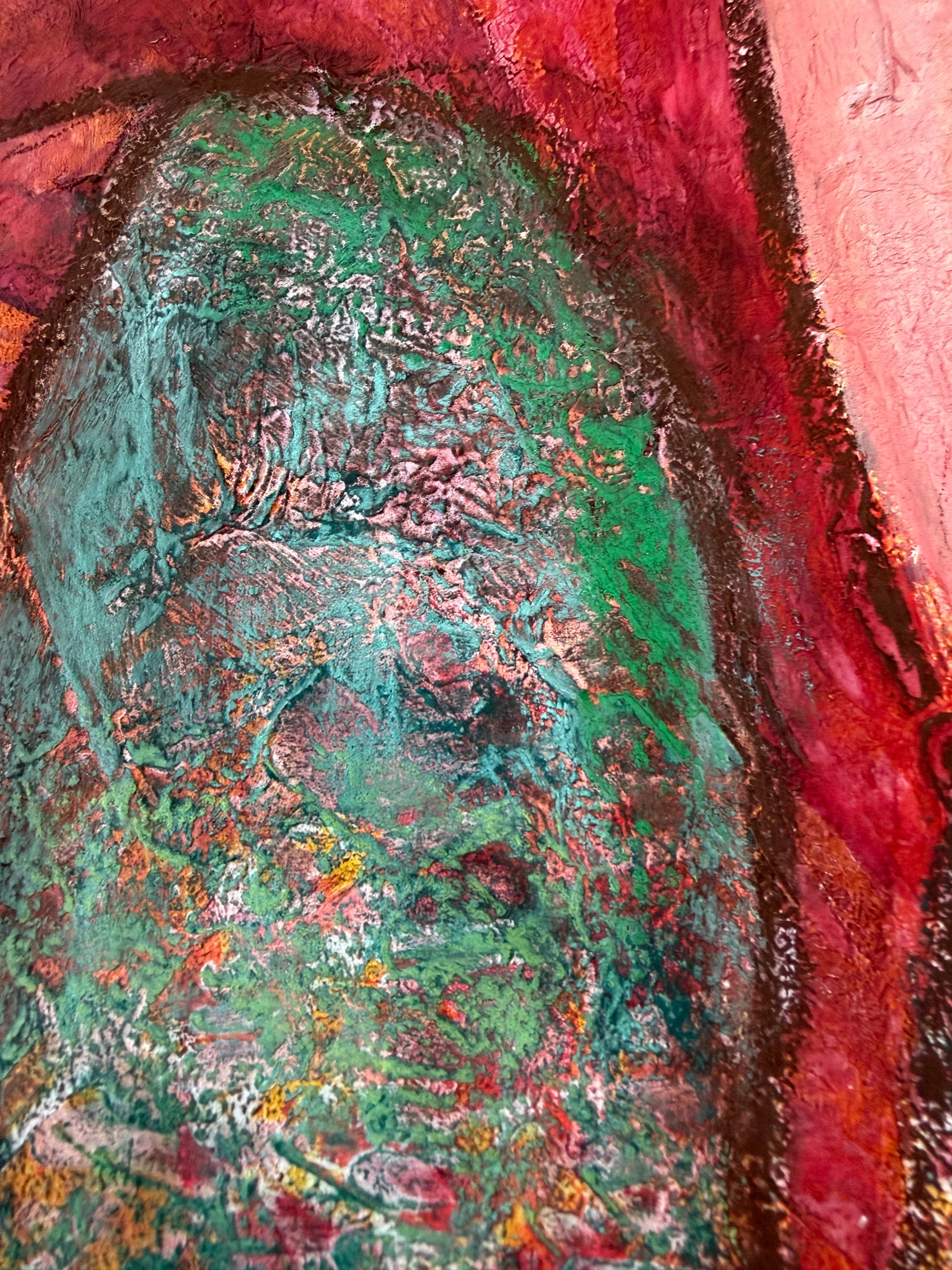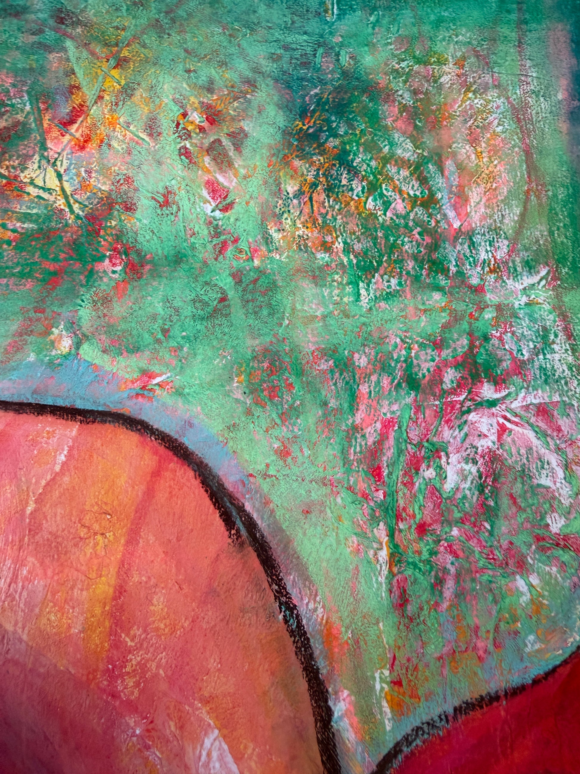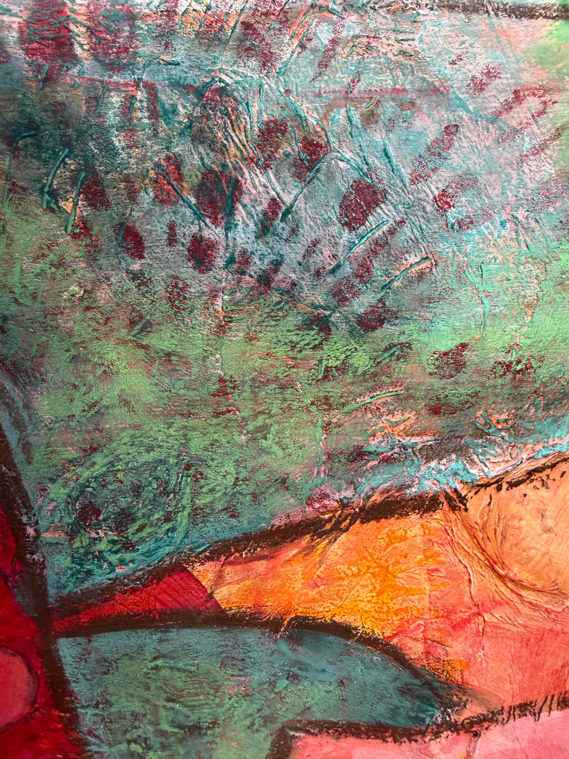 Es ist intuitiv entstanden, schablonierte Elemente, Acryl und Pastellkreide geben dem Bild eine spannende Struktur, Tiefe und farbige Lebendigkeit.