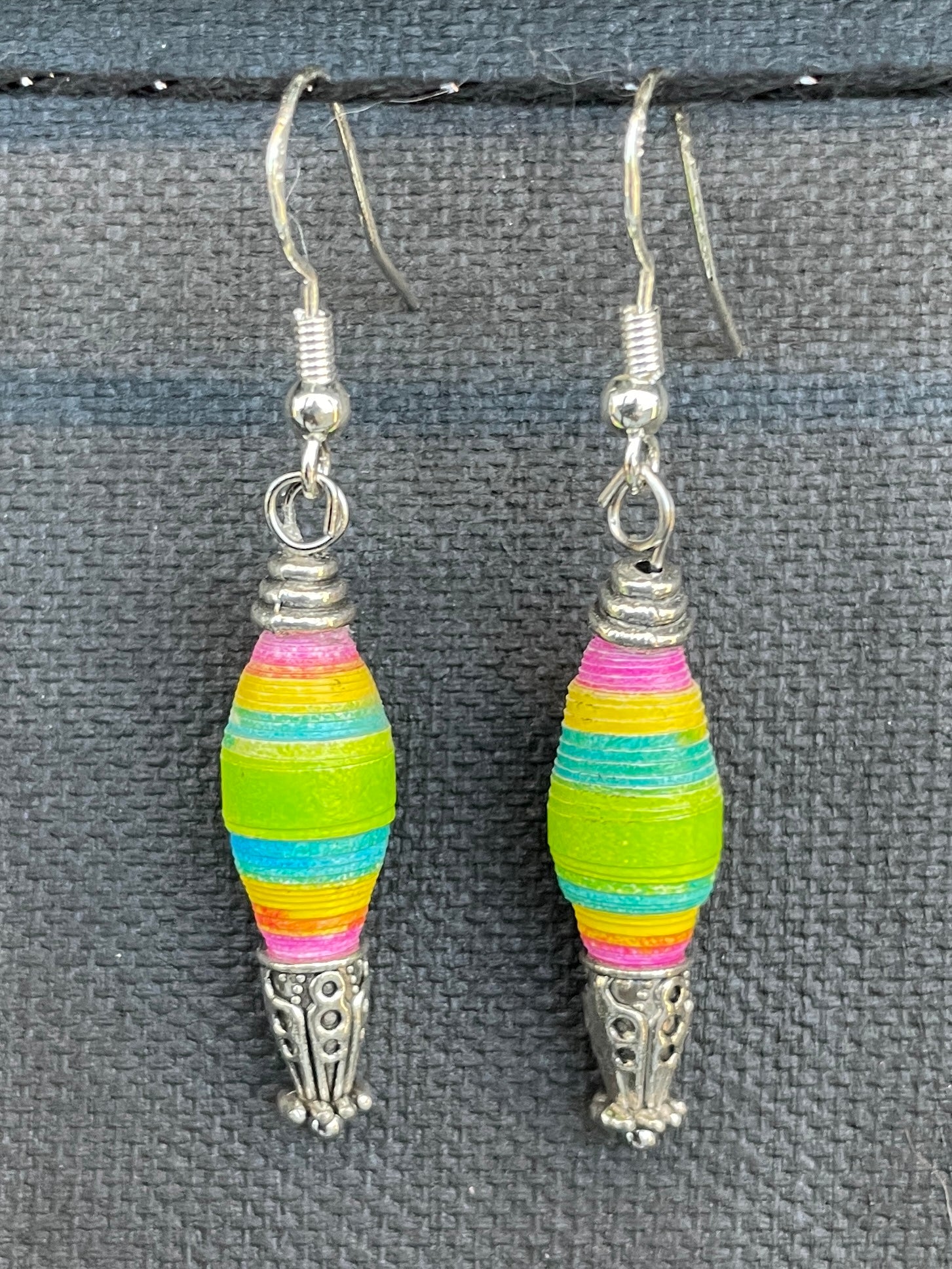 Handaquarellierte Papiere, zu Perlen aufgerollt und lackiert. Die Ohrhaken sind aus 925 er Silber.