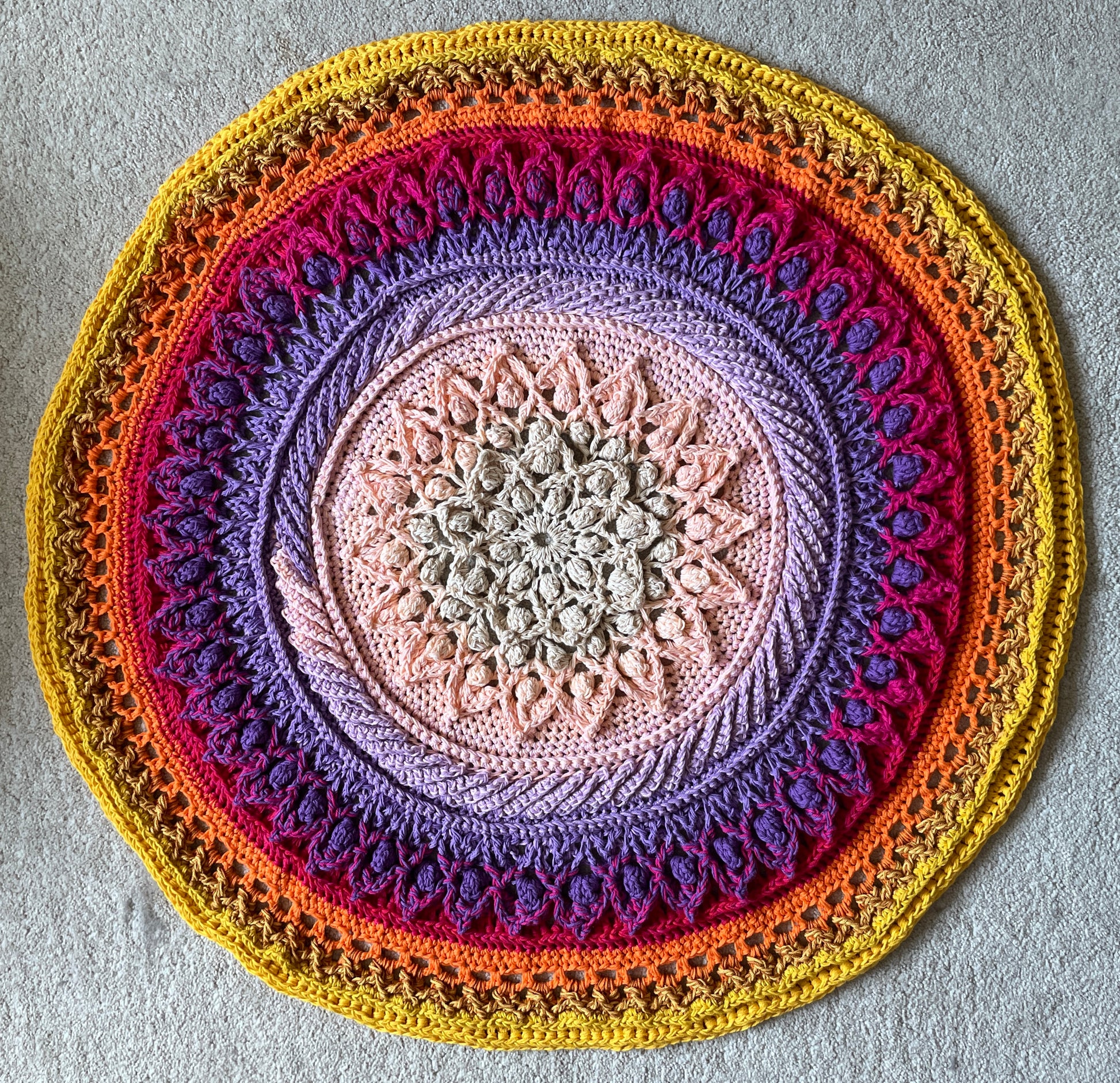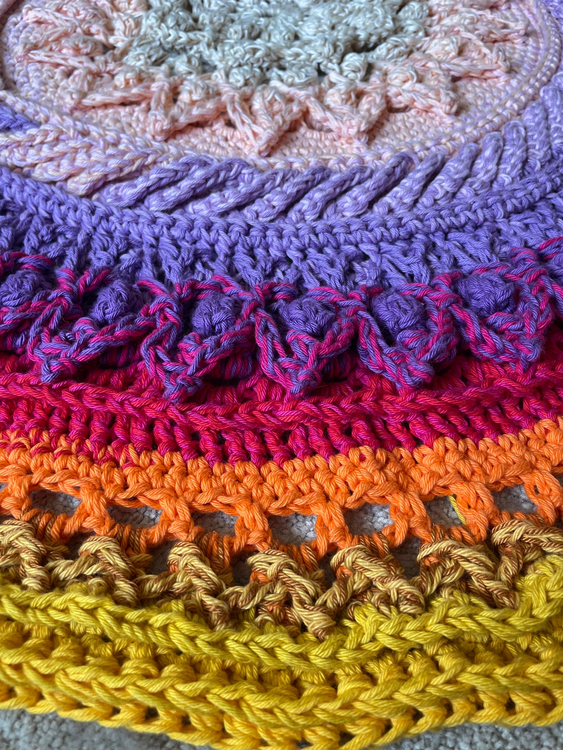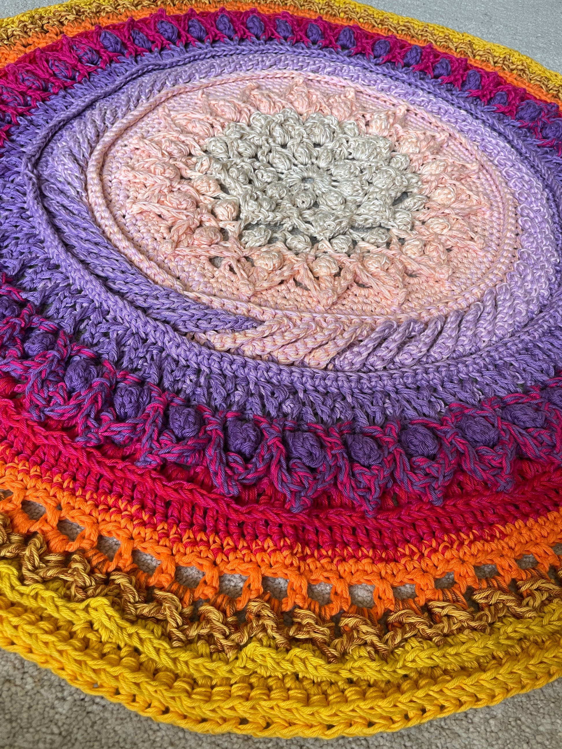 Diesen runde Teppich macht besonders seine wunderschönen kräftigen Feuerfarben und das Reliefhäkelmuster aus. Ausgebreitet vor deinem Bett, hüpfst gut gelaunt in den Tag.